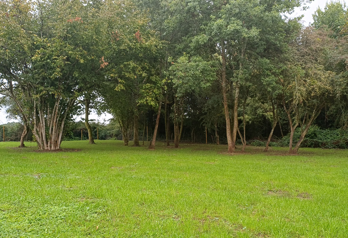 Aire de jeux engazonnée de 1500 m² avec table de ping-pong, trampoline, pétanque, badminton, balançoire et toboggan.